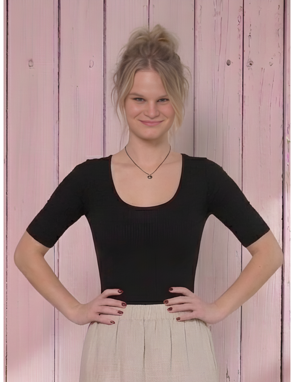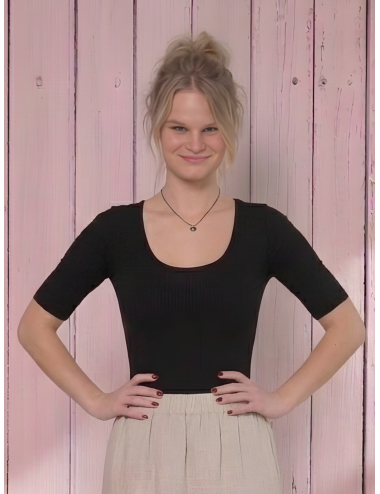 Con manga corta, es ideal para climas cálidos o como prenda base para cualquier look. Gracias a su elasticidad y suavidad, se adapta perfectamente al cuerpo y ofrece total libertad de movimiento.