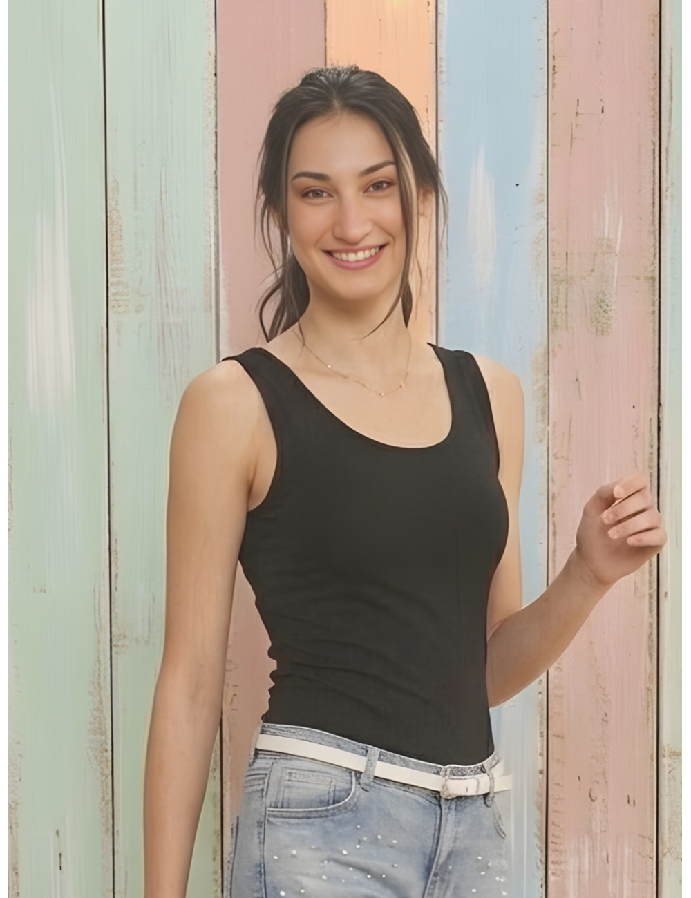 ✔ Escote redondo y sin mangas, perfecta para climas cálidos o looks casuales.