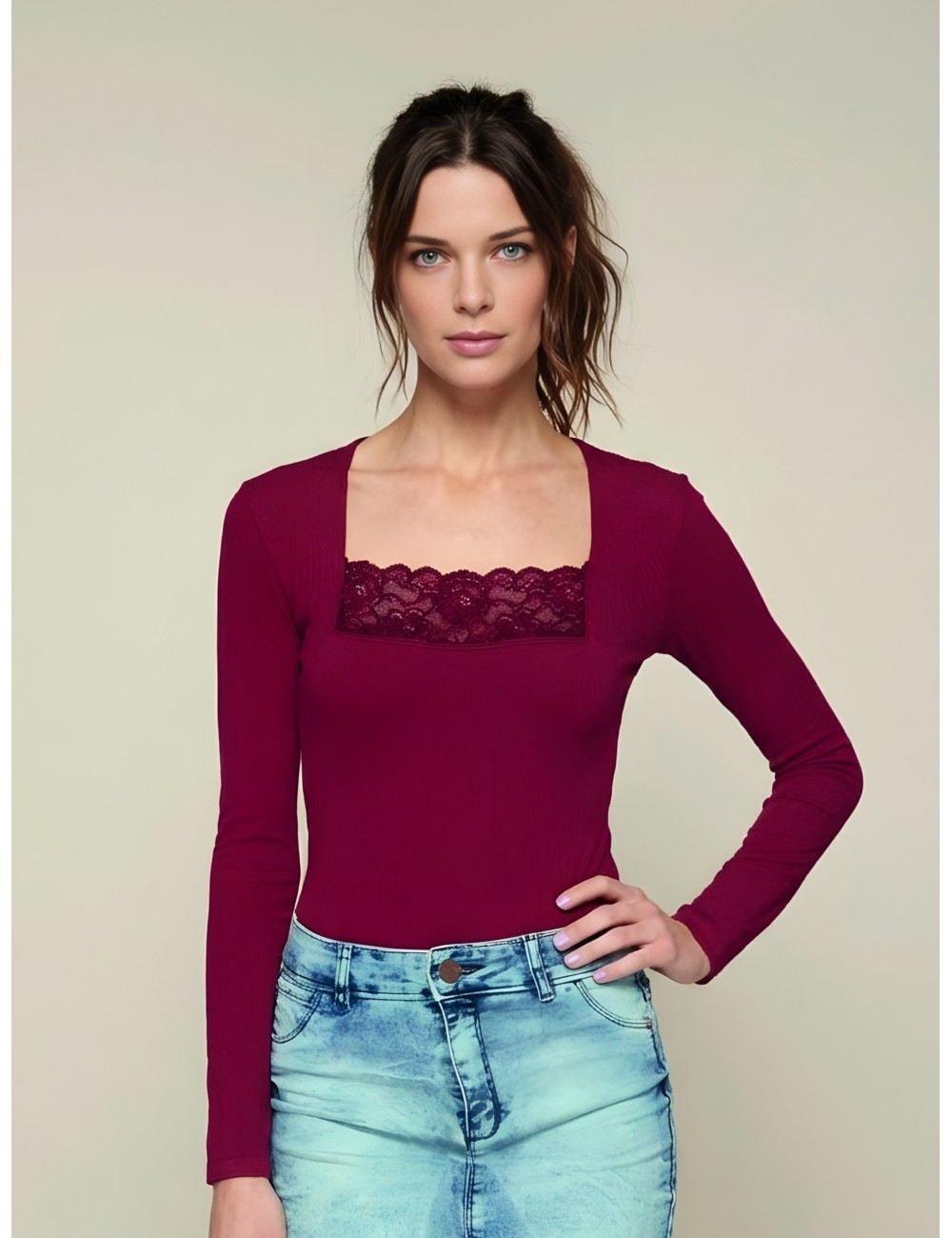 Polera seamless de microfibra con escote cuadrado y aplicación de encaje,