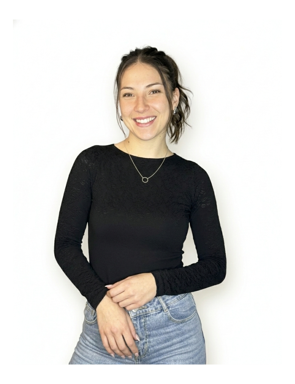 Su delicado detalle de encaje añade un toque sofisticado, ideal para lucir en cualquier ocasión. Perfecta para combinar con jeans, faldas o pantalones elegantes, esta camiseta es un básico versátil con un extra de estilo.