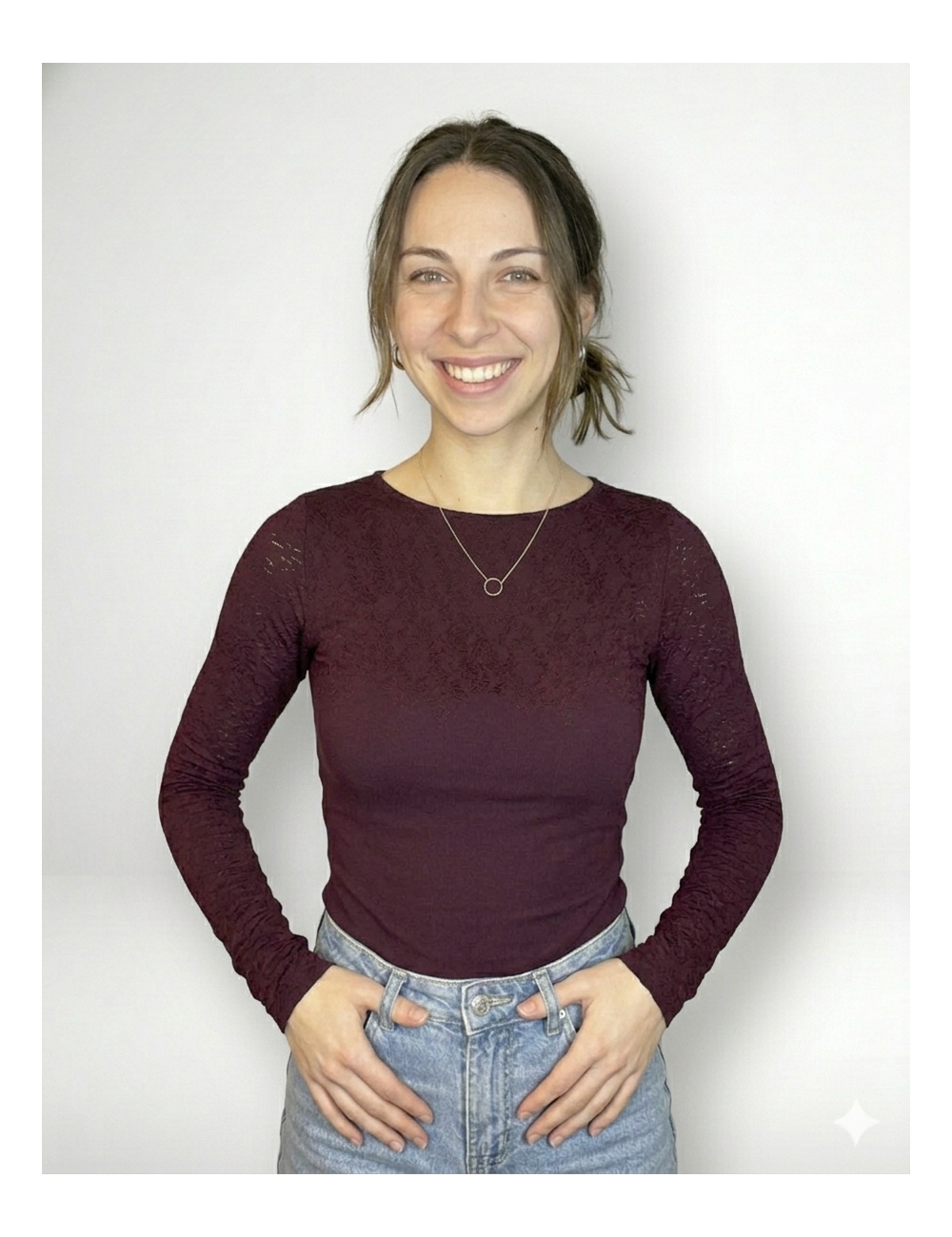 Su delicado detalle de encaje añade un toque sofisticado, ideal para lucir en cualquier ocasión. Perfecta para combinar con jeans, faldas o pantalones elegantes, esta camiseta es un básico versátil con un extra de estilo.